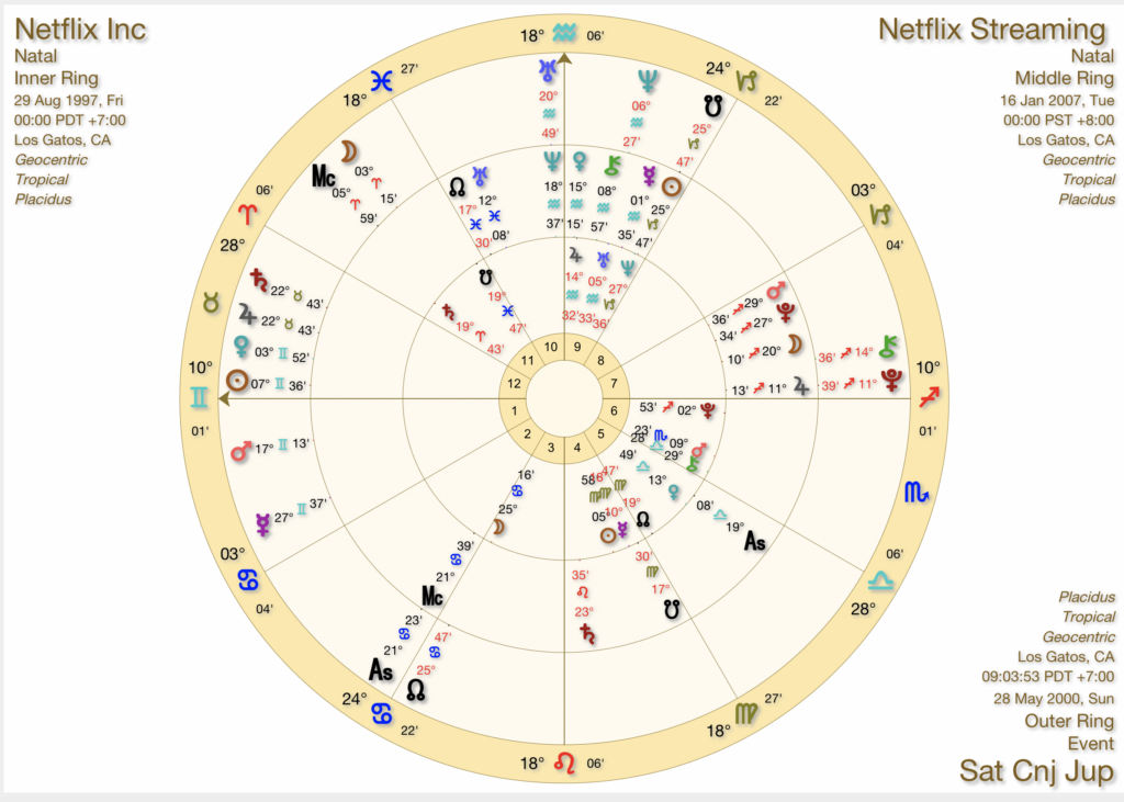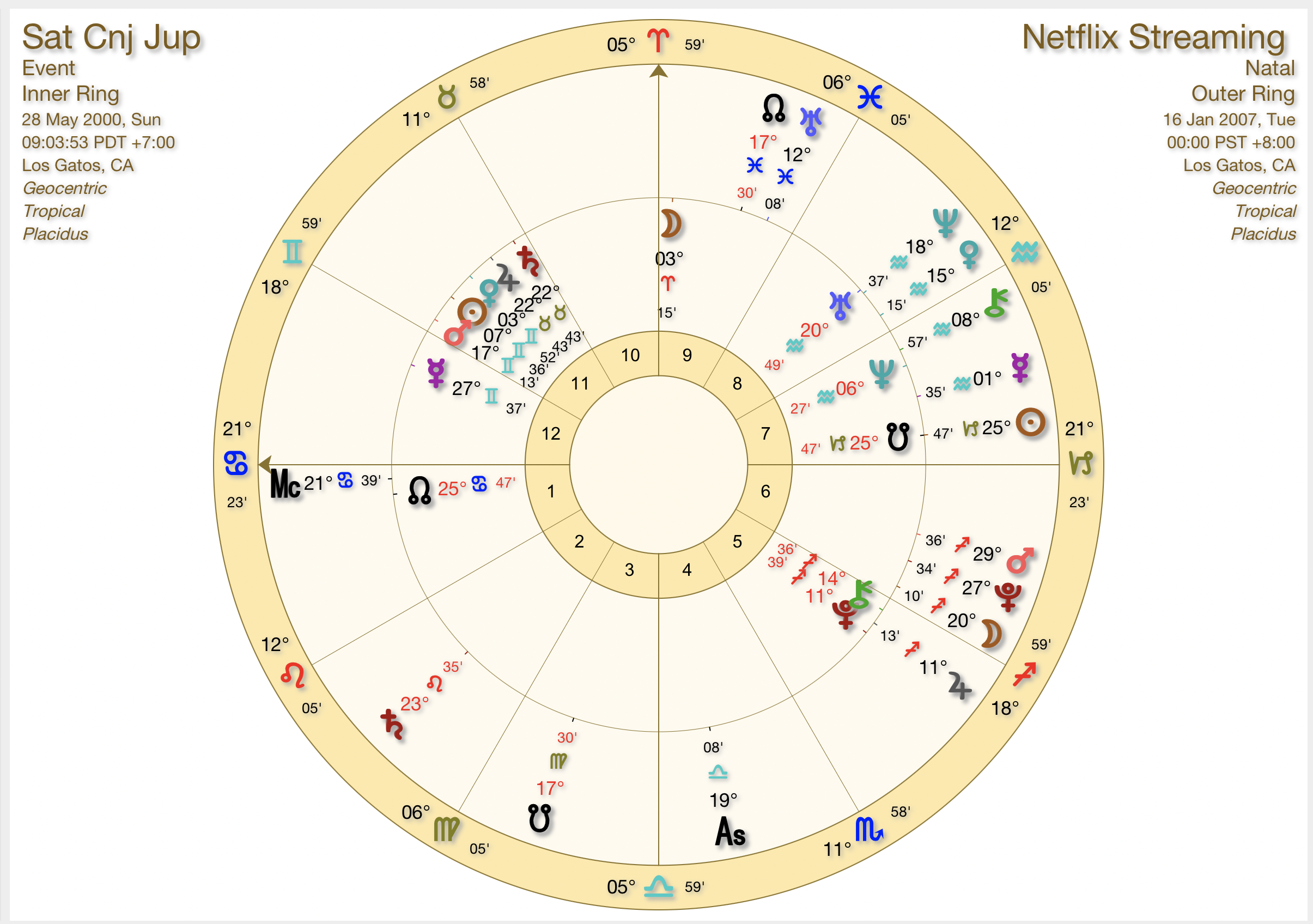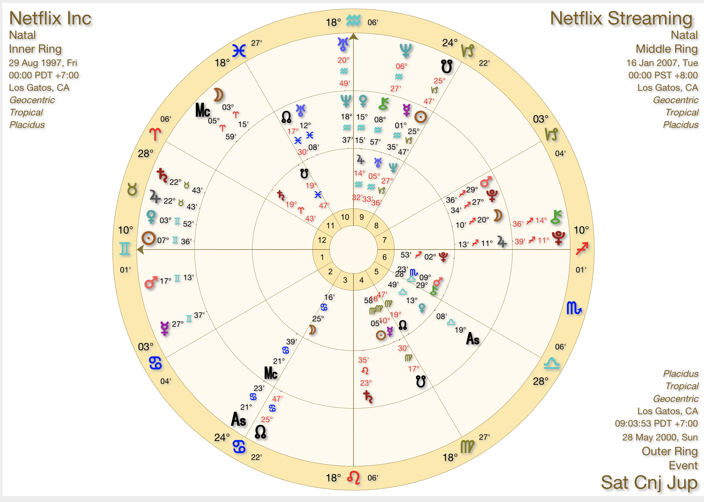 Interestingly, Netflix started its streaming service on 16 January 2007, when Venus and Neptune were conjunct at 15–18 Aquarius Neptune opposite Saturn in Leo, and Jupiter was at 11 Sagittarius square Uranus